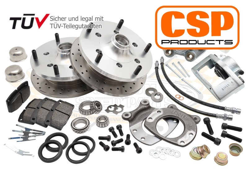 Im Lieferumfang enthalten sind folgende Teile: vormontierte Aluminium-Radnaben mit Bremsscheiben und Radlagern, Edelstahl-Nabenkappen, Bremssättel mit Klötzen und Befestigungs-Material, Halteplatten für die Bremssättel, Bremsschläuche, metrische Verbindungselemente in der notwenigen Festigkeitsklasse und ggf. Edelstahl-Staubschutzbleche. Mitgeliefert wird auch eine ausführliche Montageanleitung, die sowohl in Deutscher, als auch in Englischer Sprache verfügbar ist. Lediglich der Hauptbremszylinder muss in Abhängigkeit des Fahrzeugtyps separat erworben werden.