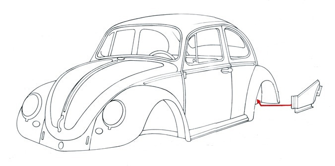 der Seite außen rechts hinter der Beifahrertür / vor hinterem Kotflügel mit Trittbrettmulde.