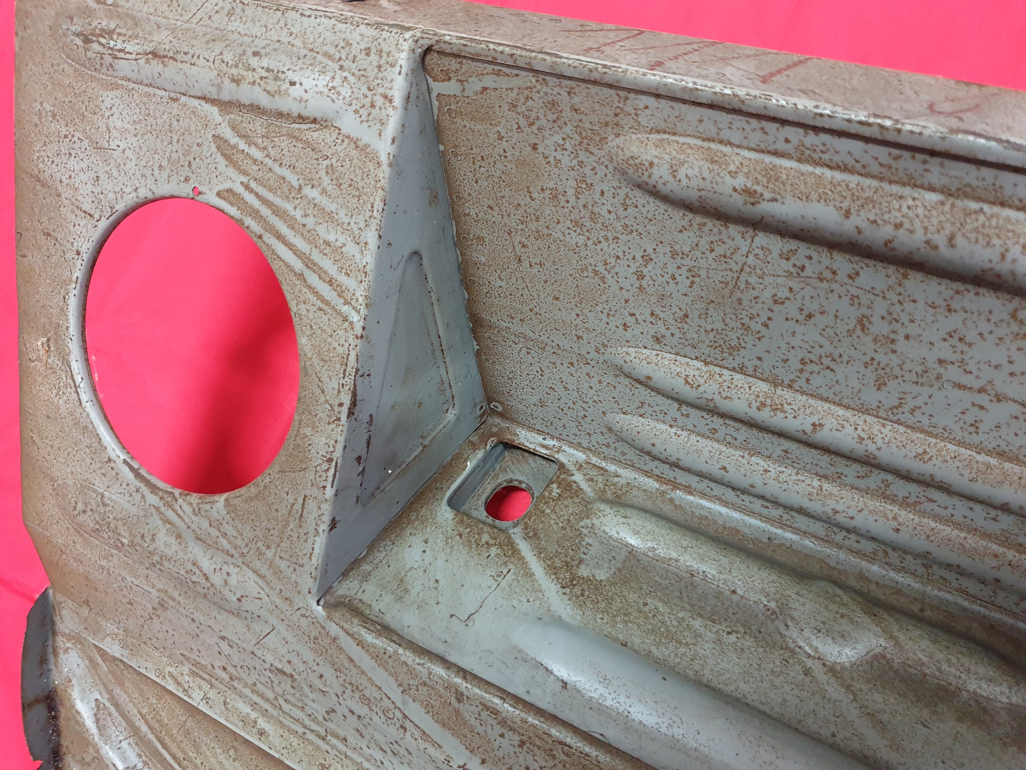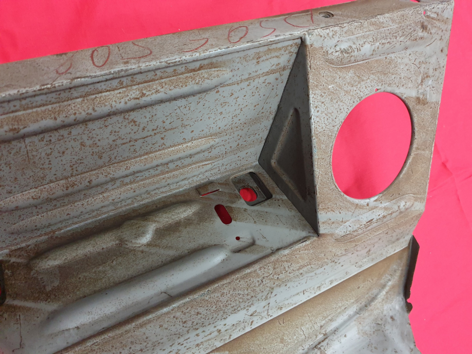 Mit Anpassungen lässt sich das Blech auch für Baujahre vor 1957 einsetzen. Hier müssten dann die Blechlaschen für die Kabelbefestigung in die Reserveradwanne eingearbeitet werden, was z.B. durch Laserschnitt geschehen kann.