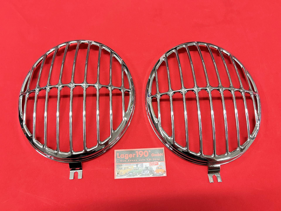 Hier gibt es 2 neue Schutzgitter (Scheinwerfergitter) für die Hauptscheinwerfer vom VW Volkswagen Bus Bulli T1 -67 und für den VW Käfer -67 (mit liegenden Scheinwerfern).
