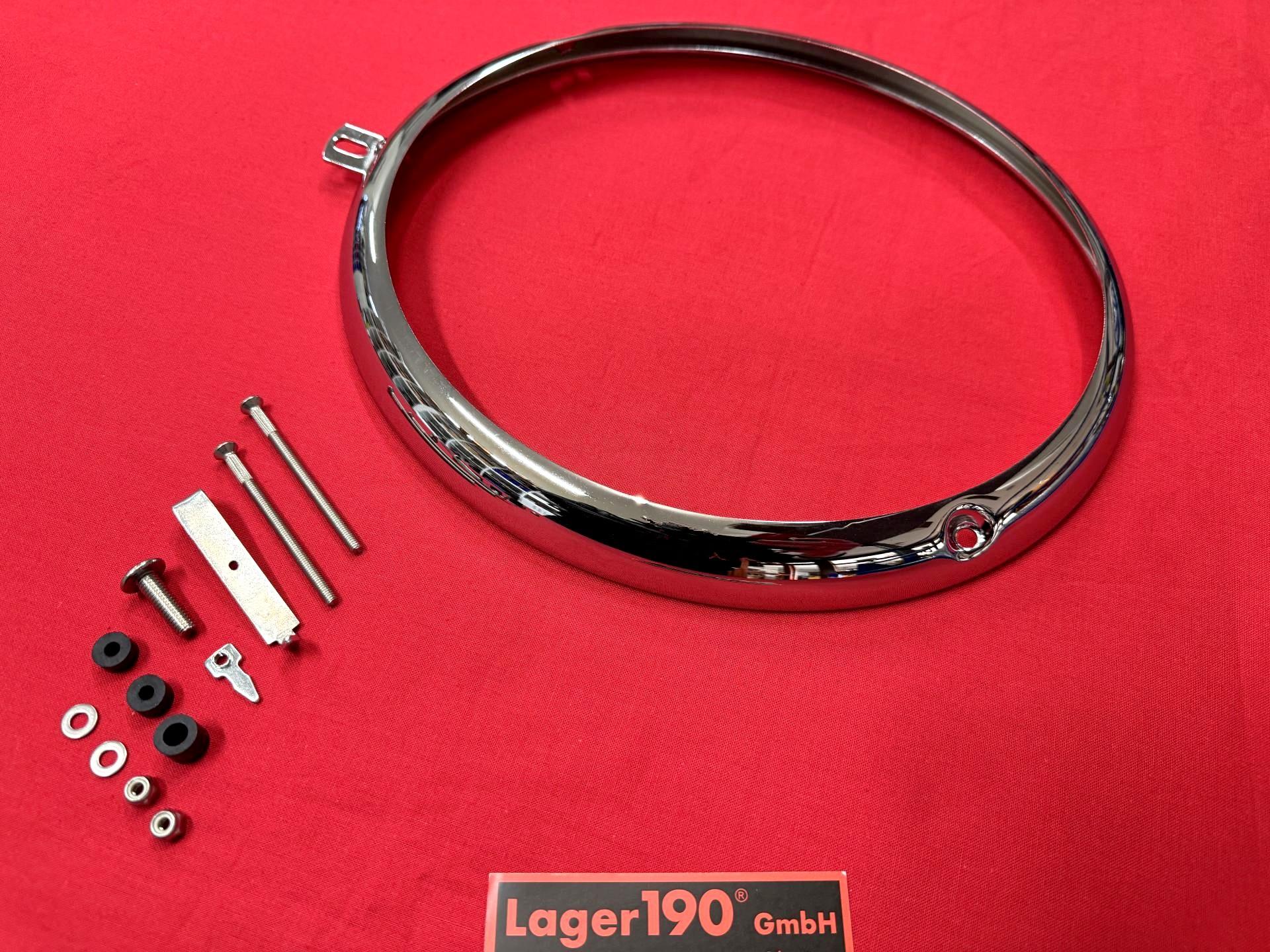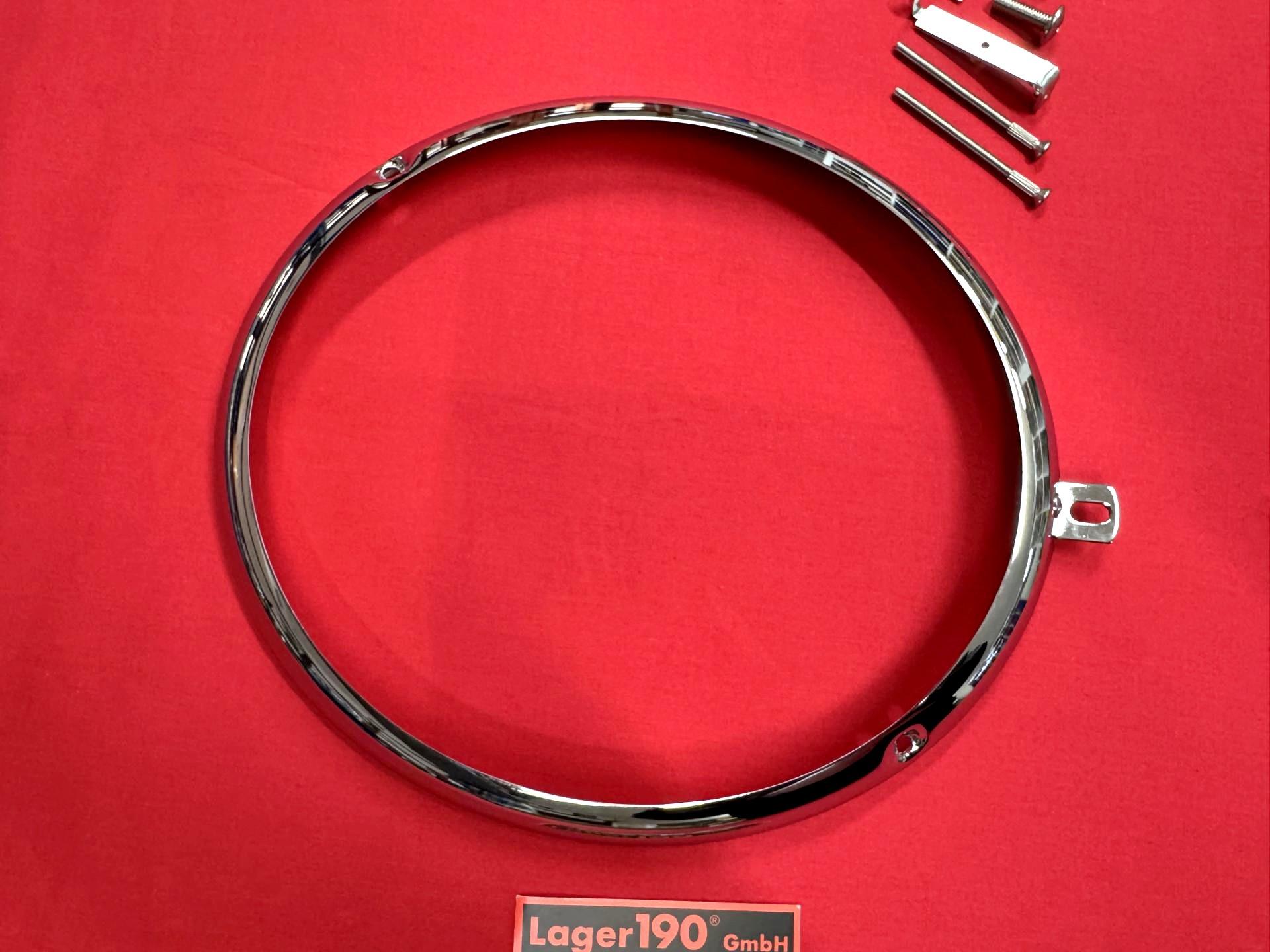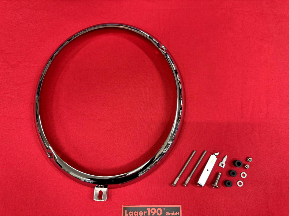 Hier gibt es den verchromten Scheinwerferring für die asymtrischen Hella-Scheinwerfer mit Schrauben auf 10 nach 20 Uhr.