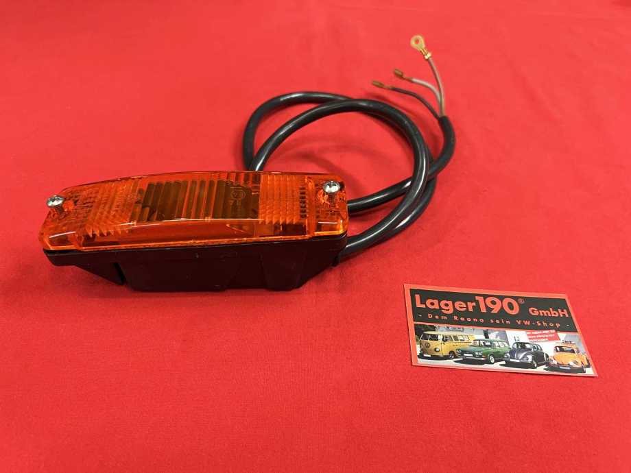 Hier gibt es einen kompletten Blinker mit orangenem gewölbtem Blinkerglas für den VW Käfer ab Modell 1975.