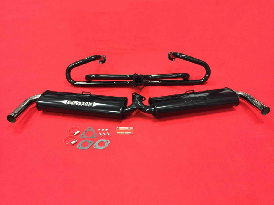 Hier gibt es einen top Sportauspuff / Auspuffanlage "Dual Quiet Pack" von EMPI USA mit Fächerkrümmer und Anbaumaterial für den Volkswagen Typ3.