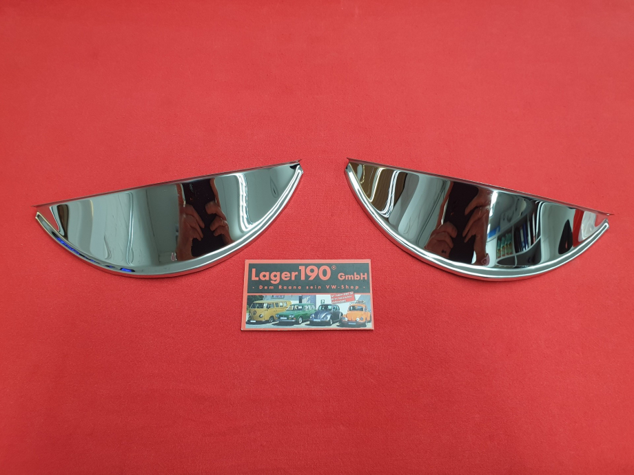 Hier gibt es ein Paar Scheinwerferschirmchen für den VW Käfer mit stehenden Scheinwerfern ab Modell 1968, Karmann Ghia, Bus T2, Typ 3 und Typ 181 Kübel.